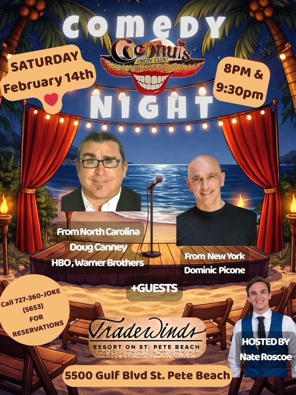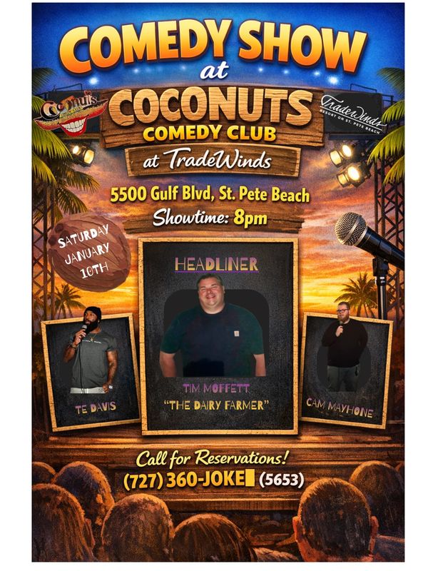 Visit a Landmark! On St Pete Beach since 1986, Coconuts is the oldest comedy club in Florida. It's intimate showroom with cabaret seating for 100 has the look, size and feel of the original Improv (1964) in Hell's Kitchen near Times Square in New York City. The atmosphere conjures up the origins of stand up comedy where the likes of Richard Pryor and George Carlin developed their acts. Notable Coconuts alumni include Jim Breuer and Darryl Hammond of NBC's "Saturday Night Live", Kevin James of CBS's "King Of Queens", Jon Stewart of Comedy Central's "The Daily Show", Billy Gardell of CBS's "Mike & Molly", and Dan Whitney, better known as "Larry The Cable Guy".